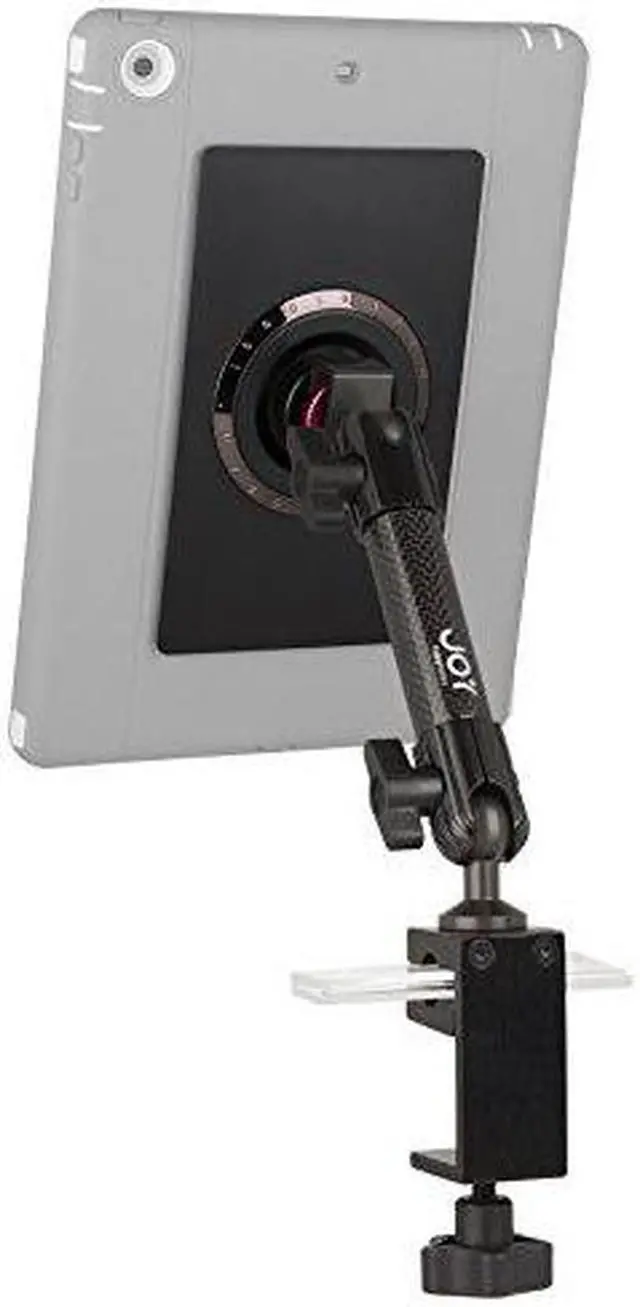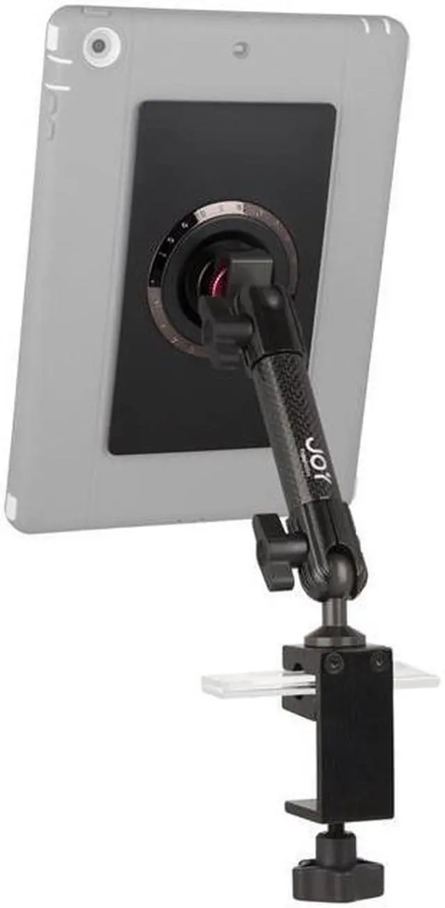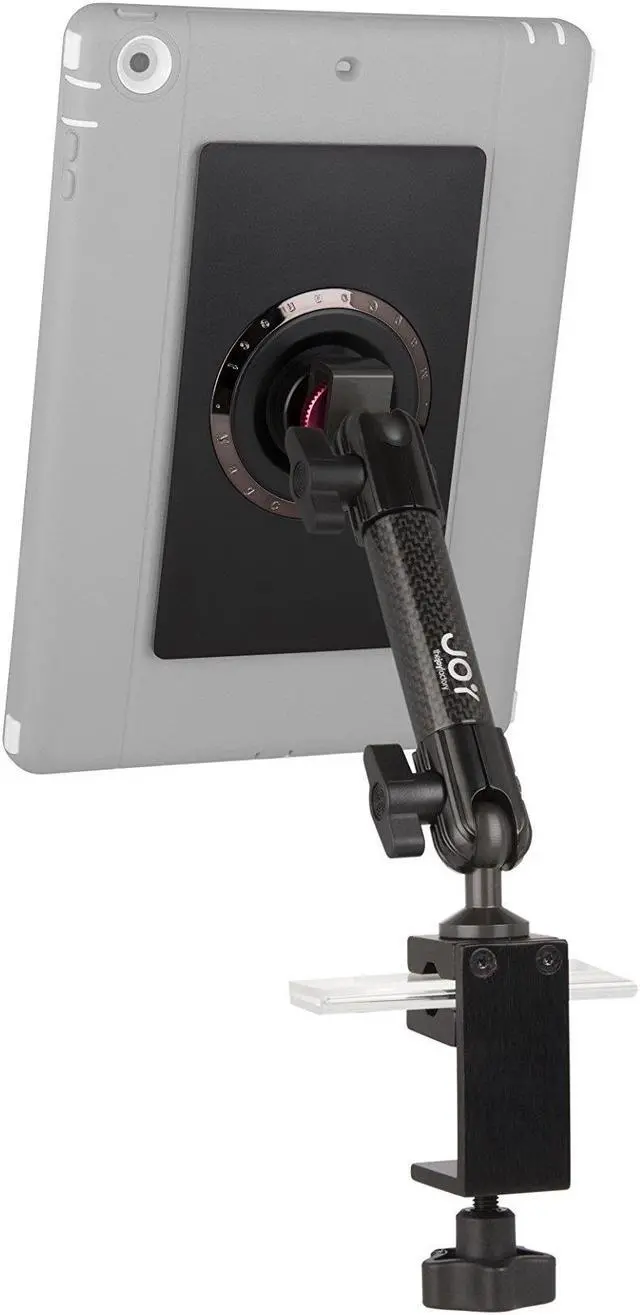 Mount Specifications Material: Carbon Fiber Weight: 2.00 lbs. Length: 6" arm x 1 Total Span: 11.875" - 13.625" Joints: 0.79" spherical joint at base x 1, 0.79" spherical joint at tablet connection x 1 Connection: MagConnect Base Specifications: Adjusts to any flat surface maximum 1.67" and any round surface maximum 1.67" and minimum 0.38"