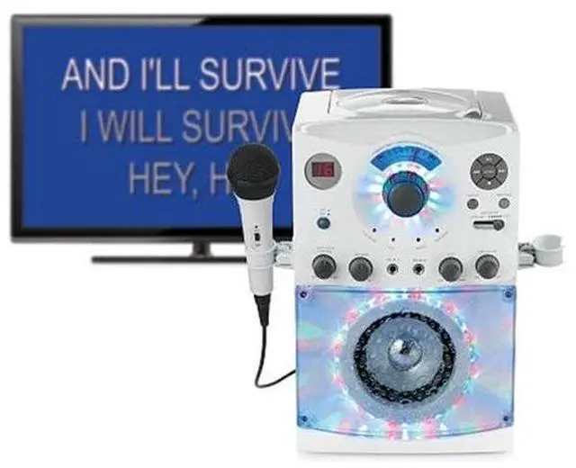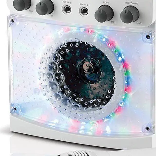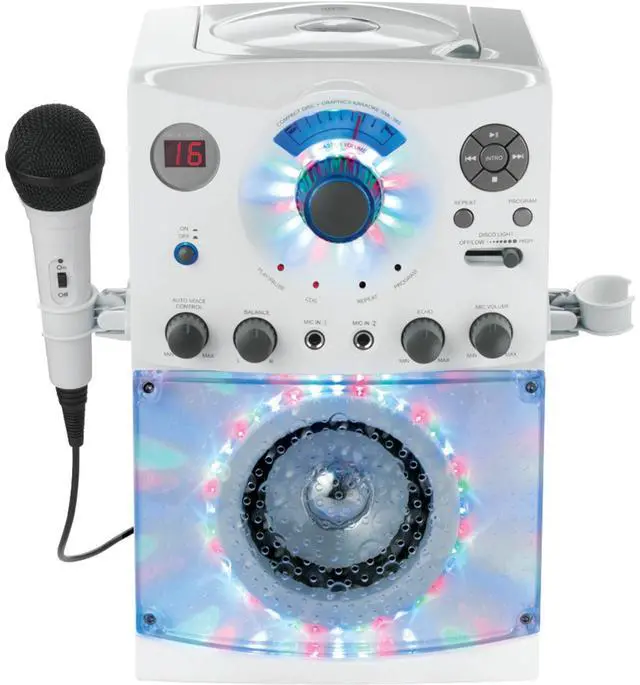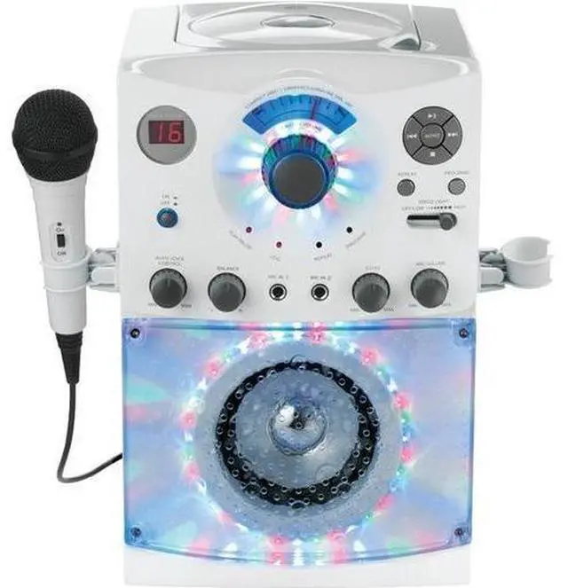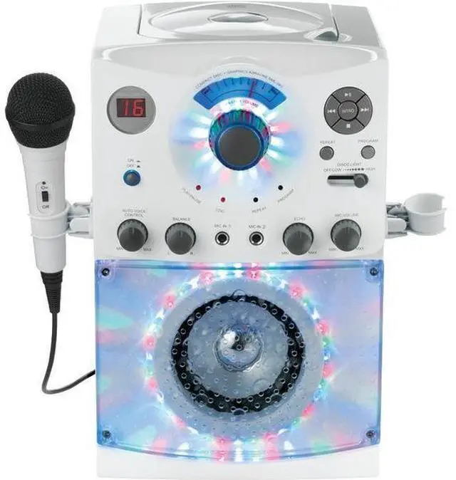 ? CD/CD+G player;? Disco light effect;? Karaoke control;? Auto voice control;? 2 microphone jacks;? Built-in stereo speaker;? White;