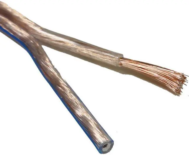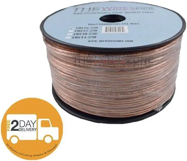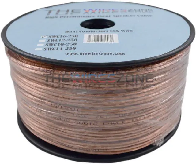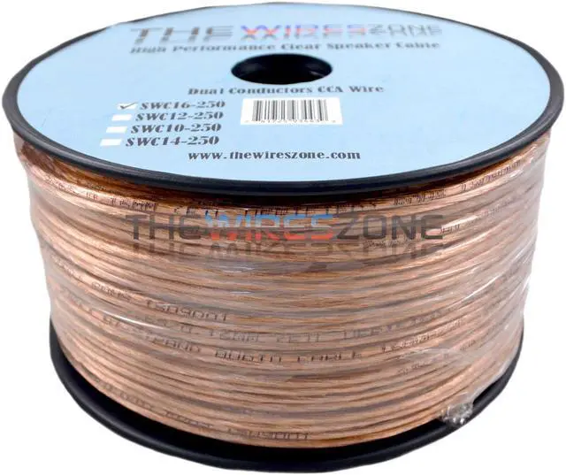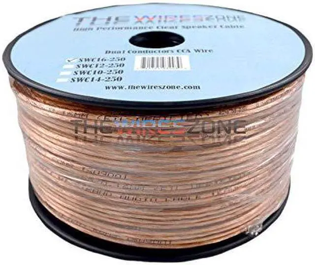 High Performance Speaker Wire 2 x 16 Gauge Stranded Conductors Transparent Jacket 250 Feet Cable Length CCA (Copper Clad Aluminum) For audio speakers, heavy duty amplifiers, PA systems, home stereos, alarm systems and more Comes in a Plastic Spool