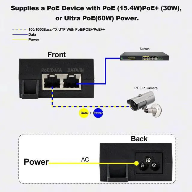 PoE Injector++ Simultaneously Transmits Data and Powers a Standard PoE Device (60W Max.) Through One Ethernet Cable, Ideal for Surveillance, Wi-Fi Coverage, and More Applications.
