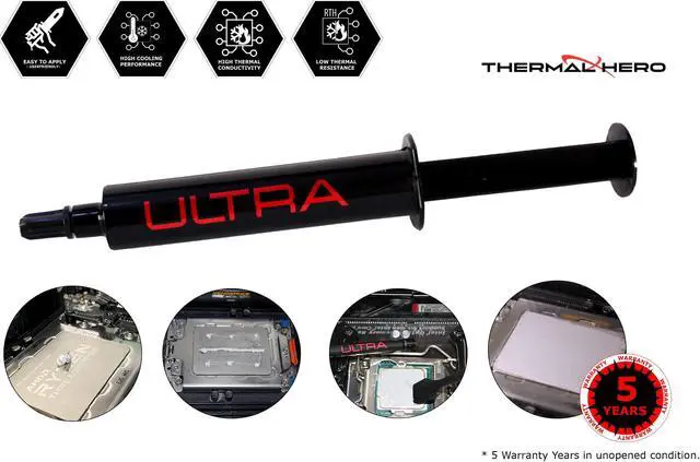 The Thermal Hero ULTRA is a silicone-based thermal paste with ultra-high cooling performance. The ULTRA series is a paste with a very low thermal resistance and high thermal conductivity. This allows the paste to achieve very high cooling performance at sustained high CPU temperatures. The paste was developed for the newer processor generations with higher clock rates, which still have overclocking potential. One of the main features of the paste is that achieve a good cooling performance at high clock rates and clock rate peaks. The paste reacts flexibly to temperature changes and dissipates heat quickly and/or constantly according to the performance requirements.