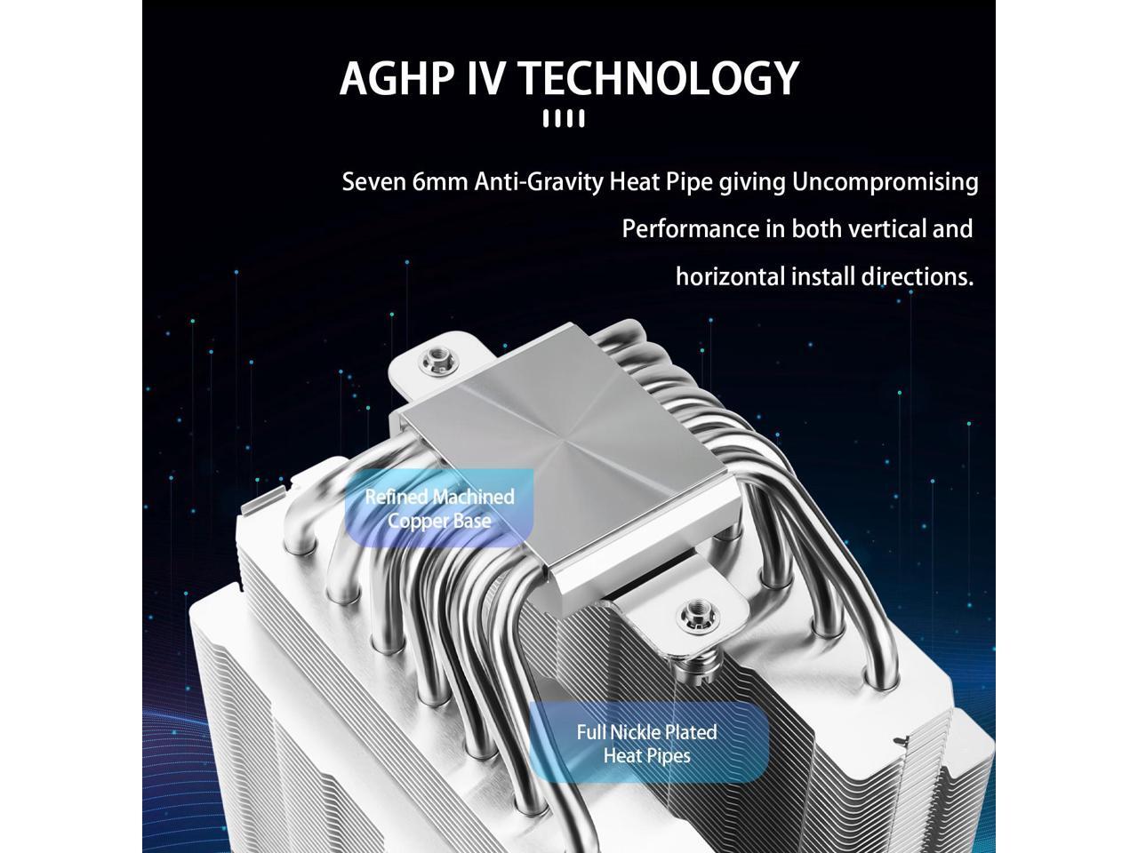 - 7x6mm heatpipe with AGHP upgraded 4th generation technology,the Inverse gravity effect caused by vertical/horizontal orientation,cpu cooler TDP is 105W to 280W