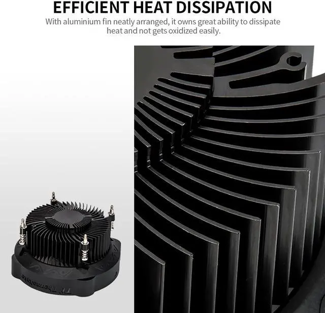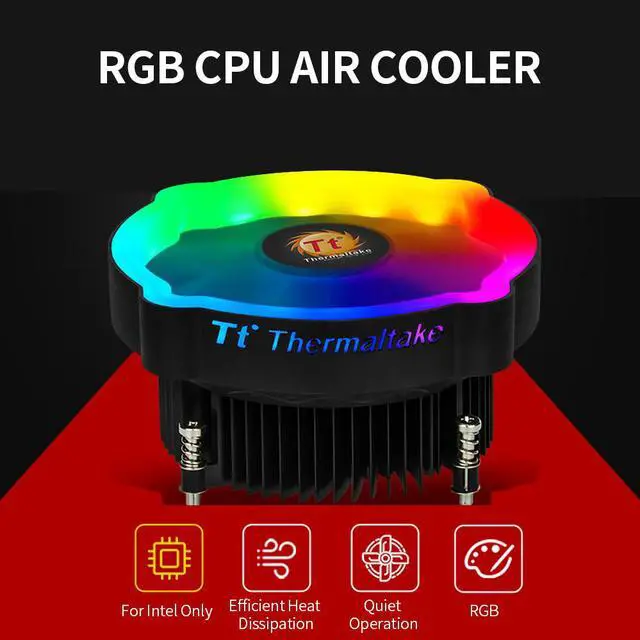 Feature: Quiet operation Durable It adopts hydraulic bearing, which makes it work more quietly and more durable. Efficient Heat Dissipation With aluminium fin neatly arranged, it owns great ability to dissipate heat and not gets oxidized easily. RGB LightingEffect It lights your case in a cool way, but the ring will not generates light if you don't turn off the DC speed regulation inside the motherboard BIOS. Push Configuration With this design, it will not only blow away the heat of the CPU, but also that of the hardware around the motherboard. Polished Bottom With its bottom polished, it is in close contact with CPU, effectively improving the heat-dissipation performance. Compatibility This CPU cooler is designed for Intel CPU which consumespower below 65Wlike Core I3/I5/I7, Celeron, Pentium.