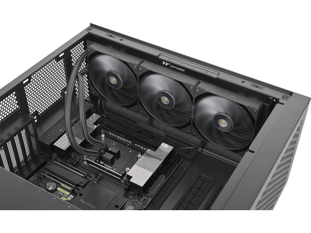 Removing heat from the 420mm radiator are three 140mm TOUGHFAN PROs capable of 3.57mm-H2O static pressure, 119.6 CFM of airflow, and RPMs from 500~2000. Achieved by advance LCP blades that have been tuned for both airflow and static pressure.