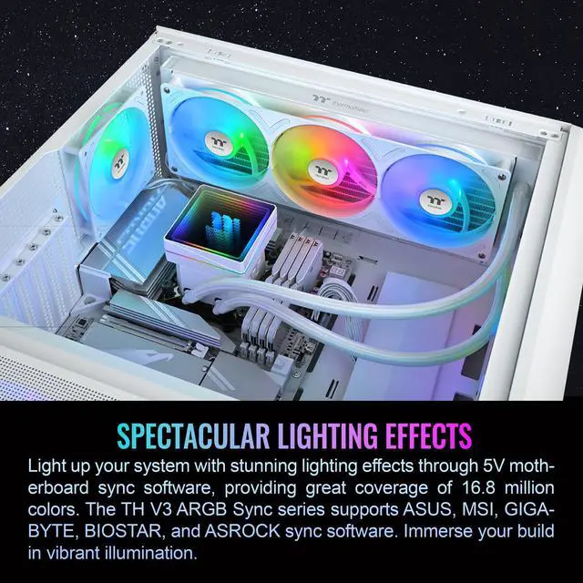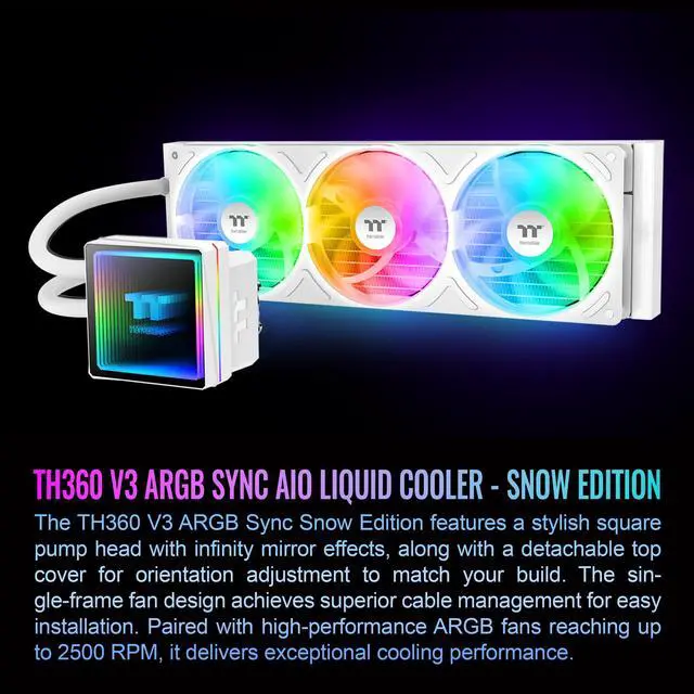 Adding on to the TH Series of coolers the V3 line up adds new features like rotatable pump heads for optimal display, single frame fans that not only perform but also are easy to maintain, and to top it off an ARGB infinity mirror.