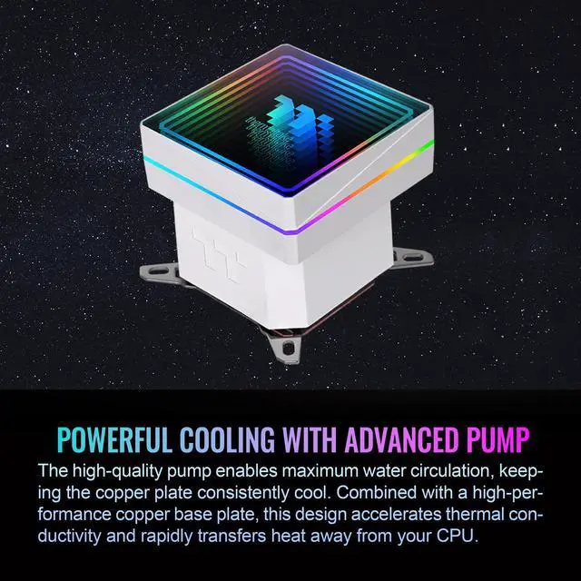 Featuring a large infinity mirror sitting atop the pump block that provides depth and is equipped with ARGB LEDs and daisy chain connectors for an easy way to sync up all the lighting in your system.