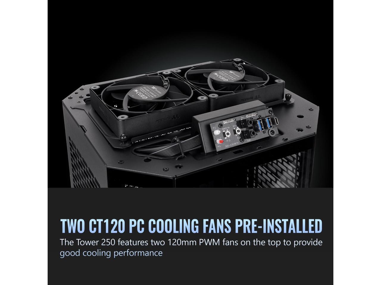 - Keep it Cool With 2x 120mm pre-installed exhaust fan on the top, the Tower 250 can accommodate up to 8x 120mm fans.