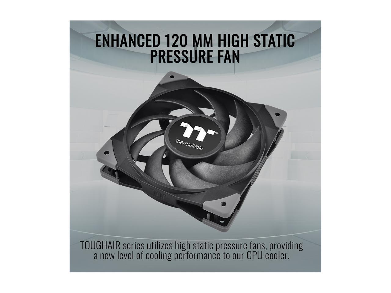 - TOUGHAIR series utilizes high static pressure fans, which leverages the TOUGHFAN 12 design and boosts the fan speed to 2000 RPM, providing a new level of cooling performance to our CPU cooler.