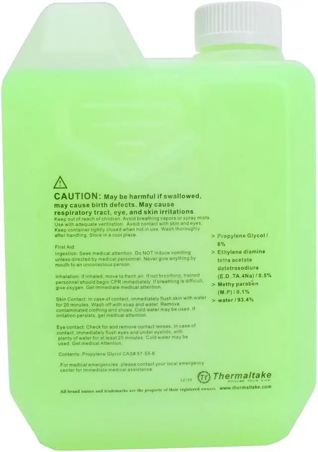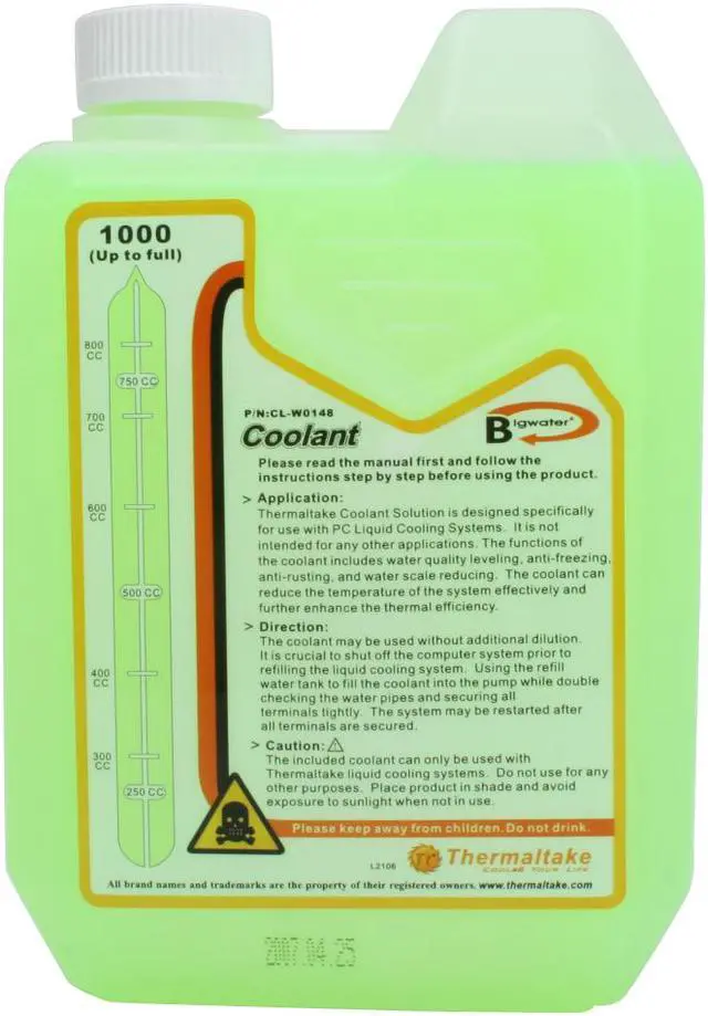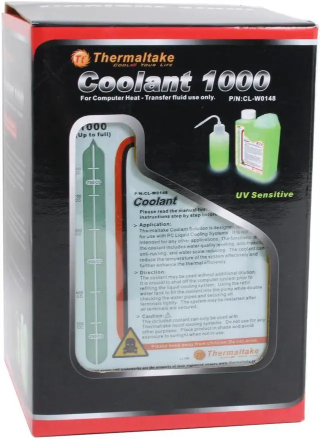The Thermaltake CL-W0148 coolant is a great companion to your high-end water cooling system. In addition to the regular role of intermedia for heat transfer and dissipation, it also includes the functions of water quality leveling, anti-freeze, anti-rusting and water scale reducing, and protects all cooling system metals from corrosion and cavitation including aluminum.