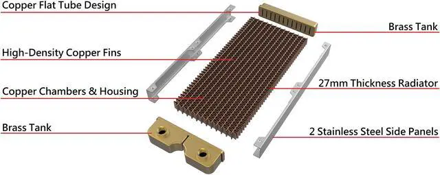 Unlike most of copper radiators on the market, the radiator utilizes stainless steel made side panels that increase the durability and strength of the radiator while reducing the weight.