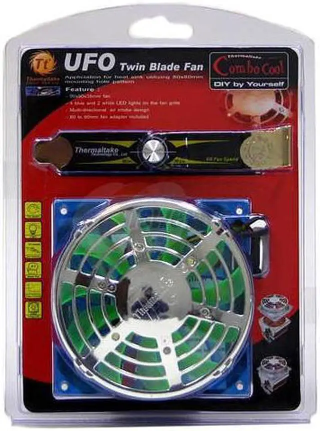 | Features | Smart UFO Fan (3 functions in 1) : 1. Full speed when jumper on 2. Temperature control : Fan speed varies according to the temp detected by the sensor 3. Manual control : Adjust fan speed manually 80 to 90mm fan adapter included, improves the performance of CPU heatsink Fan speed controller fits on PCI slot |