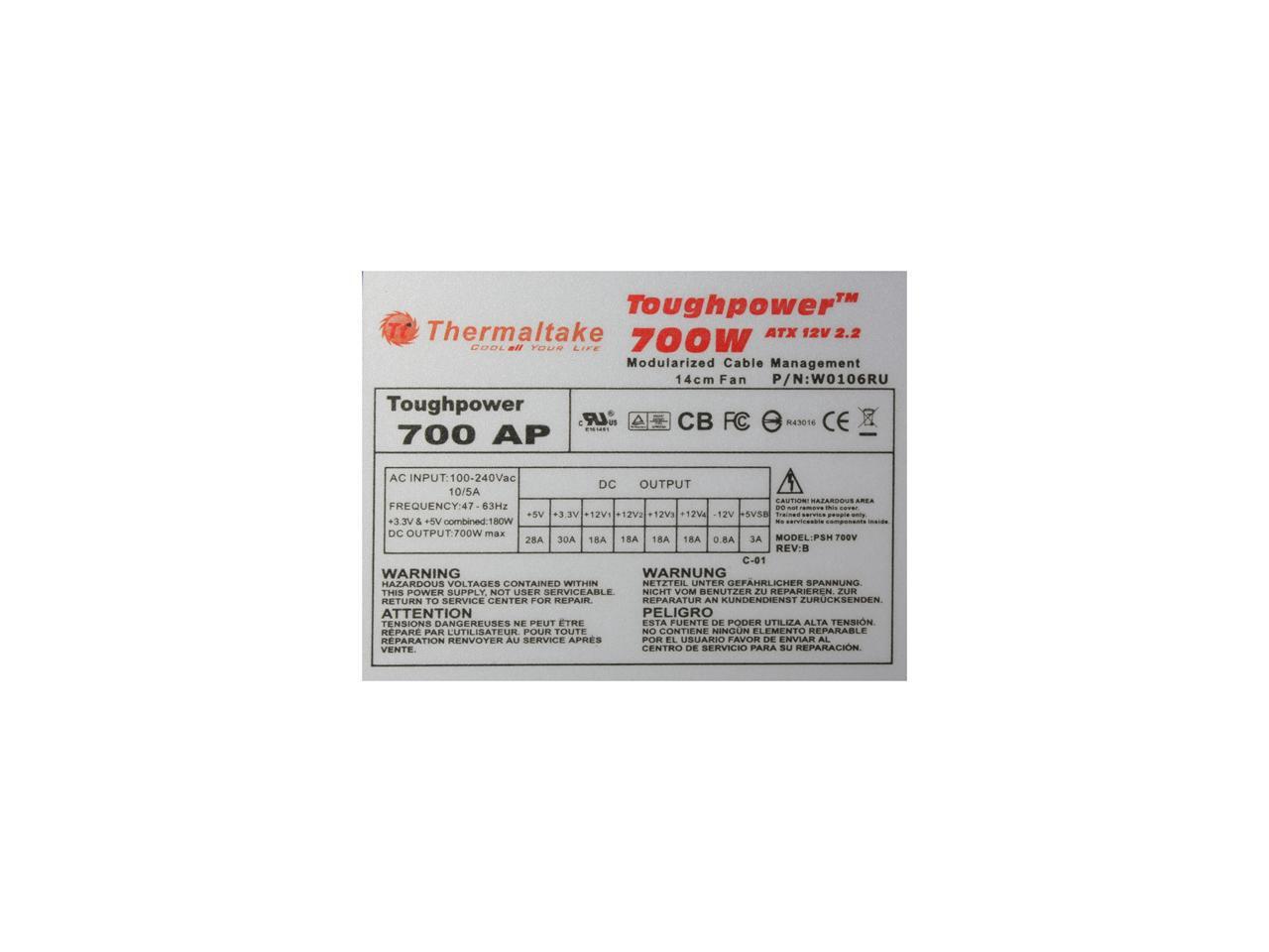 ATX12V v2.2 and EPS12V CompatibleCompatible with the ATX12V v2.2 and EPS12V standards, the Thermaltake Toughpower 700W (W0106RU) provides maximum power stability to drive the latest Intel and AMD processors as well as other components for desktop and entry-level server computer systems.