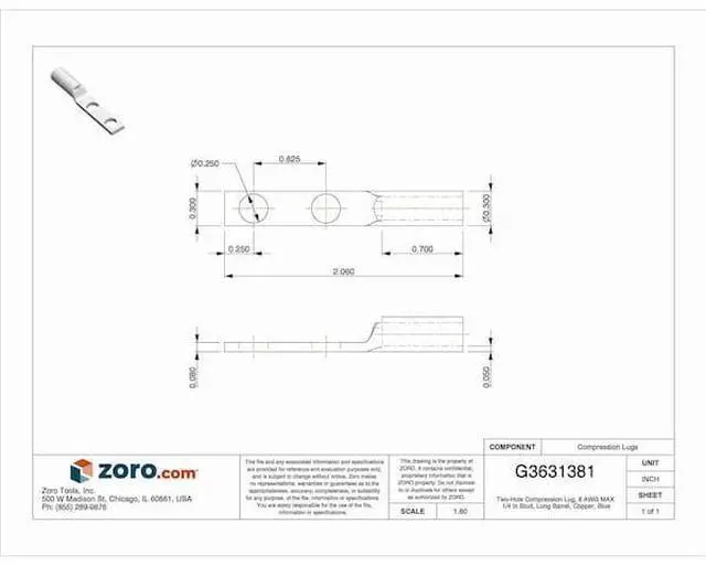 Compression Lug, Barrel Size Long, Color Code Blue, Die Code 24, Tongue Angle Straight, Tongue Width 0.11 in, For Conductor Material Copper, For Stud Size 1/4 in, For Stranded Copper Wire Size - Maximum 6 AWG, Inspection Hole Yes, Hole Center to Center 0.625 in, Material Copper, Maximum Voltage 35 kV, Termination Style Crimp, Standards CSA Certified, UL E9809, Number of Holes 2, Barrel Outside Diameter 0.3 in, Connector Type Straight Barrel, Contact Finish Tin, For Wire Size 6 AWG.