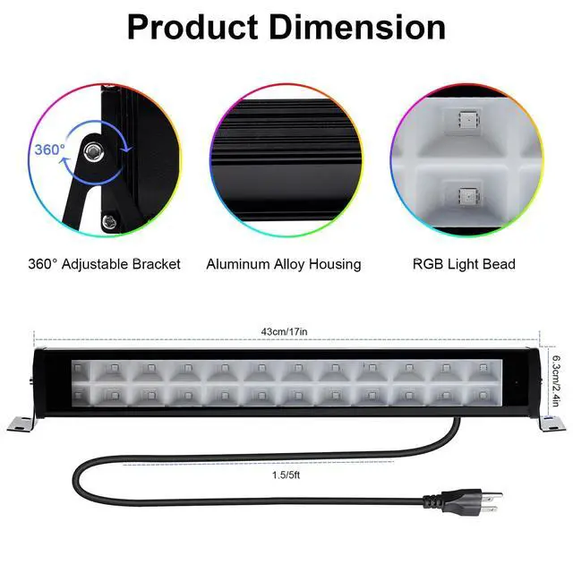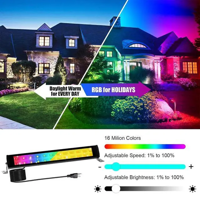 Multifunctional 50W RGB with 3000K warm light wall washer design The 50W RGB wall washer uses 24 high-quality RGB LED chips and has a 3000K warm light effect. It generates low heat, is super bright and energy-saving, and can run all night. RGB LED floodlight features 16 million color changes, flash, strobe, fade, smooth and more with 20 modes (adjustable brightness/speed). You can choose different colors or modes for different scenes, and the RGB wall washer can meet all your lighting needs.