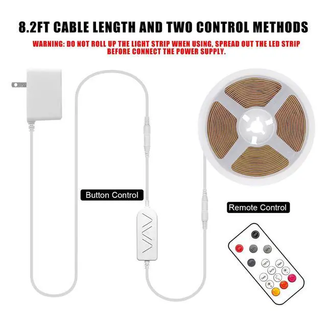| Included | 1 x 16.4ft/5m COB Strip Light ?1 x 24V Power Supply?1 x Dimmer ?1 x User Munual?RF Rmote (Connector not included) |