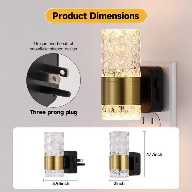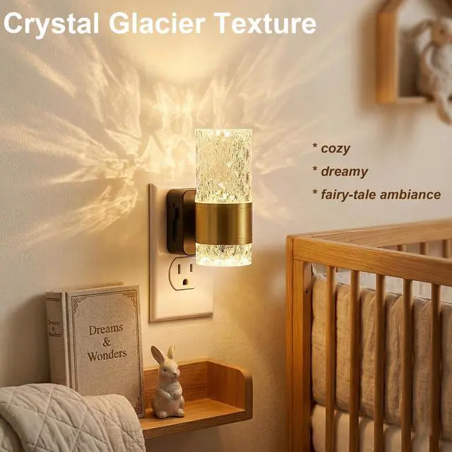 Crystal Glacier Texture of Bubble Night Light This plug in night light features a modern unique ice-cracked crystal finish that refracts light into a beautiful, ambient glow. When illuminated, it casts 3000K soft light patterns, creating a cozy, dreamy, fairy-tale ambiance for your bedroom or nursery. This plug in night light also has bubbles in the middle layer, making your room more fun.