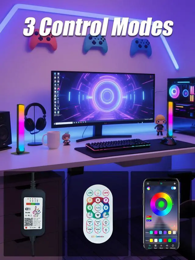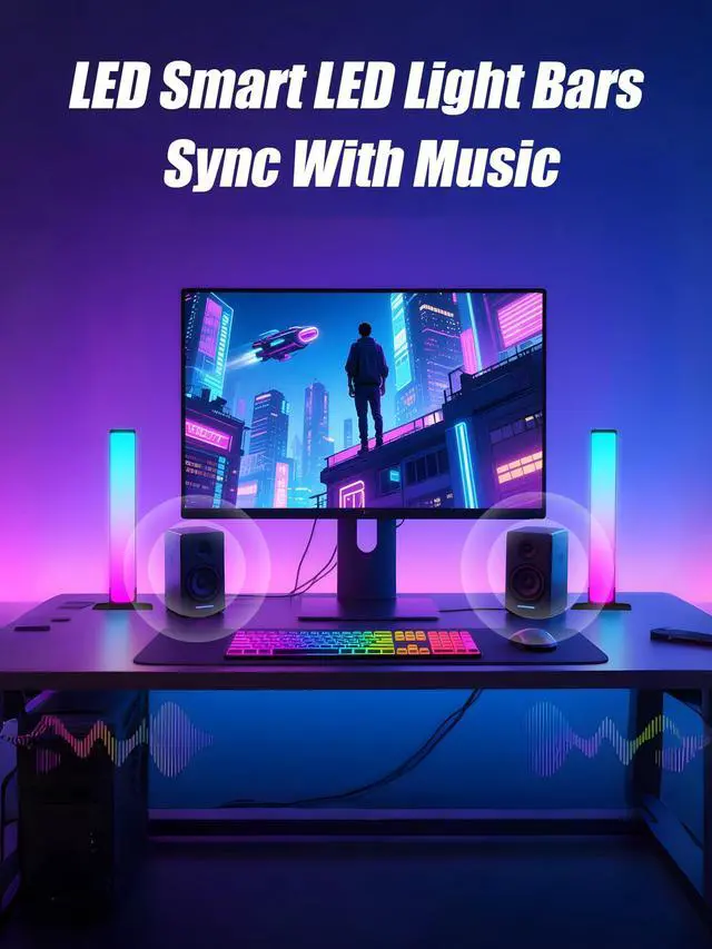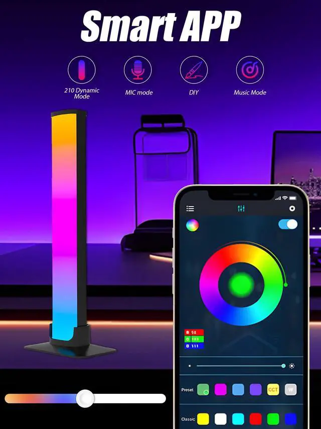 Colorful Smart LED Light Bars for RoomOur Smart LED Light Bars feature premium LED chips, boasting 16 million vivid colors and 213 preset dynamic lighting modes. Deliver stunning rainbow-like light effects and create an immersive, thrilling lighting experience for gaming, leisure and daily use.