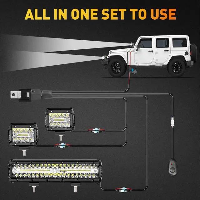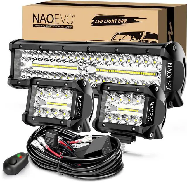 2 Pcs 4inch Led Light Pod, 1 Pcs 12inch Led Light Bar, 1 Set 3-Lead Wiring Harness, 3 Set Installation Accessories