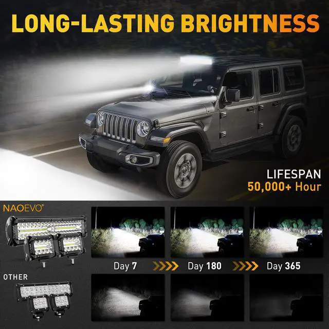 [Excellent Performance] - NAOEVO LED light adopts die-cast aluminum housing and advanced sealing technology, waterproof level reaches IP68, and with a sturdy PC lens, which effectively resist rain, snow, sandstorms and other harsh conditions. Moreover, the back of each light is designed with 10 cooling fans to efficiently dissipate heat. The combination of these superior functions results in light lifespan of up to 50000 hrs, ensuring reliable driving in demanding environments.
