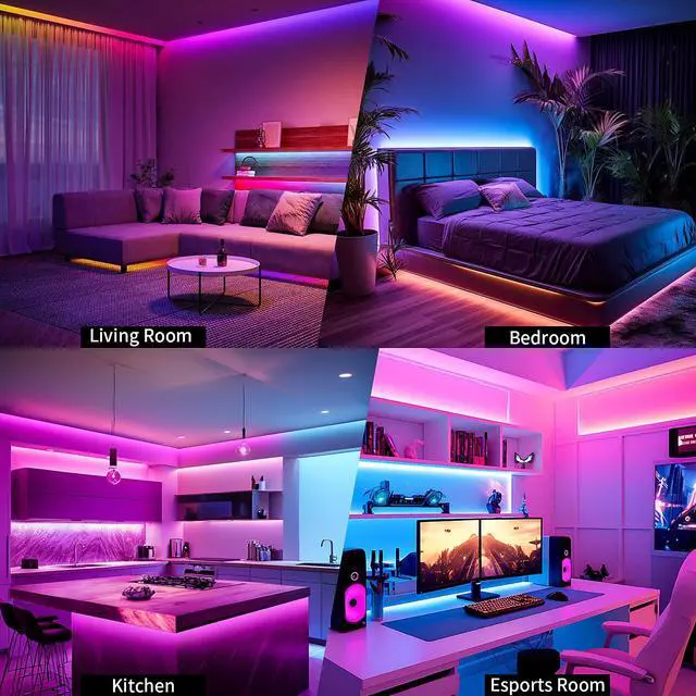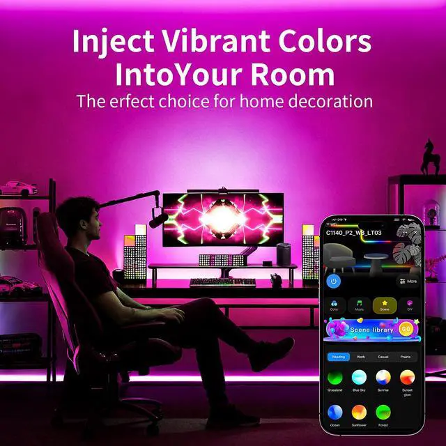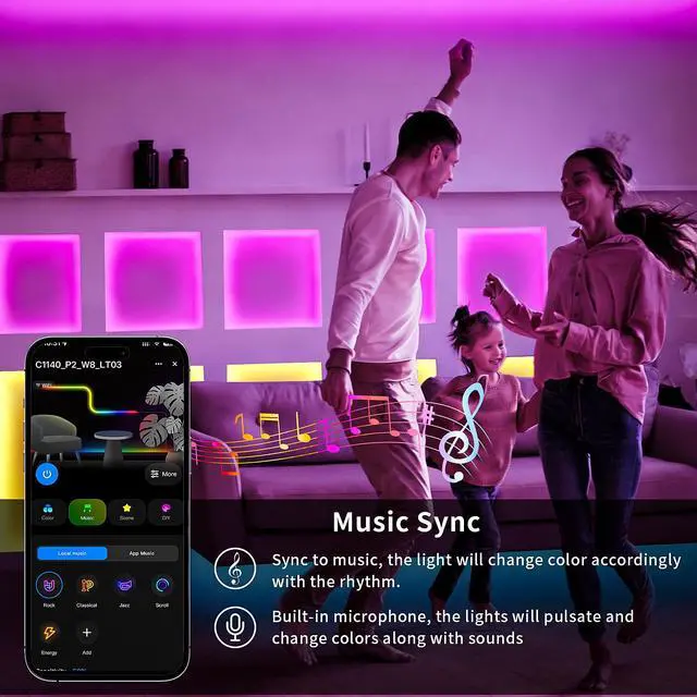 • Music Sync: The built-in mic make the LED lights color-changing with the ambient music,easily create party atmosphere.