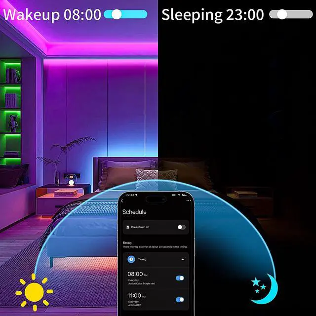 • Timing Setting: The Led strip will turn on/off automatically at the setting time, repeat this seting on date you set.
