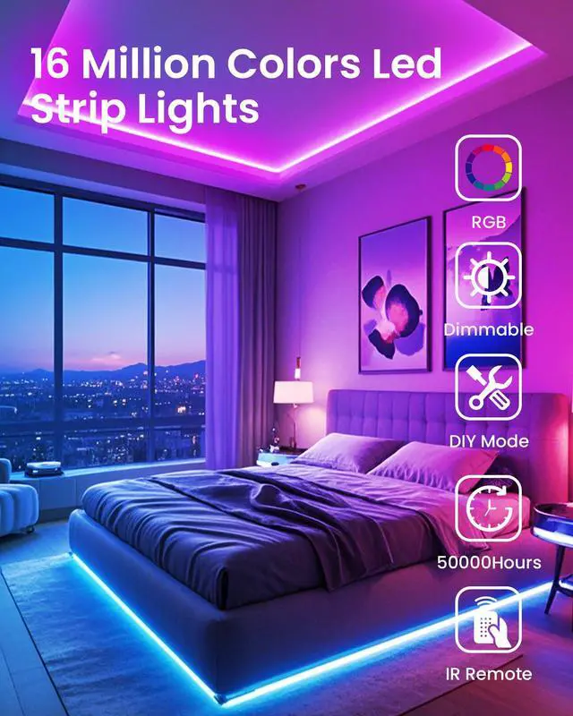 Multiple Scenes Available: The led light strips take your home ambience to the next level; 16 millions color options rgb led strip lights create a colorful atmosphere and affect the entire mood of the space you are in; The smart led strip lights also has color memory and setting the time function