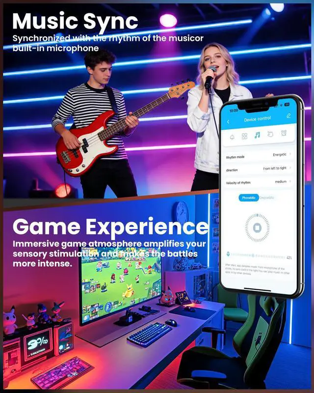 Music and Mic Function: Sync the smart bluetooth led lights for bedroom 200 ft bluetooth to your favorite music in the party; The led light strips is sync with the music or built in microphone, led room lights colors and speed automatically adjusting base on the rhythm