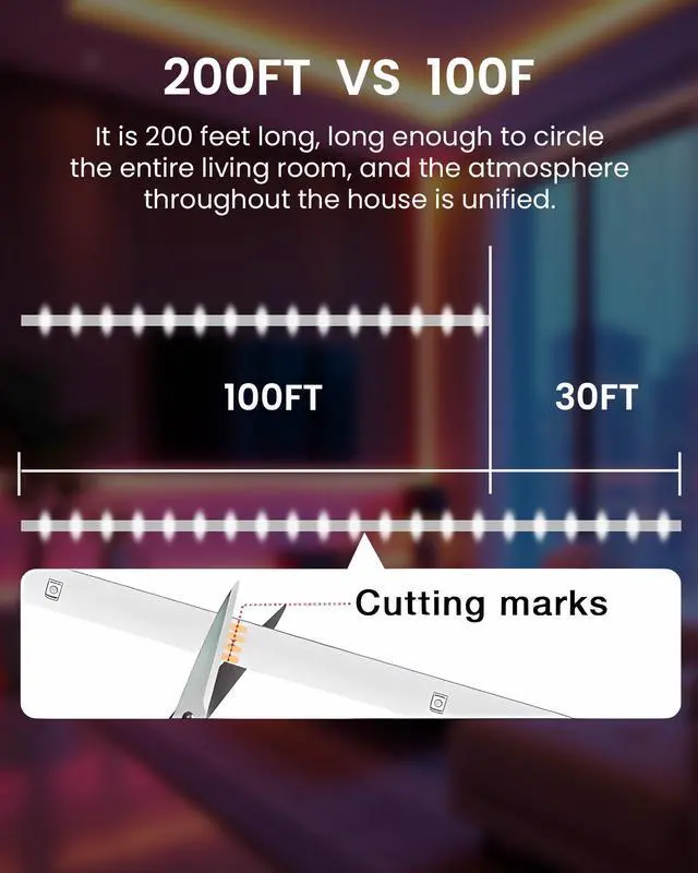 Ultra Long LED Strip Lights: The 200ft led light strip comes with 2 rolls of 100 feet ; Its Long enough to decorate the entire room; Led lights for room decor is suitable for bedrooms, kitchens, stairs, dining rooms, ceilings, and large party areas.