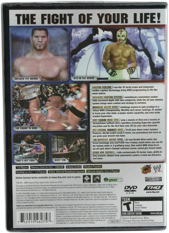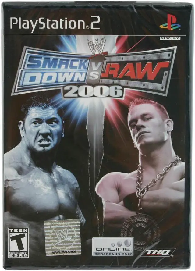 | Features | From the most successful wrestling game series of all-time comes the ultimate achievement in sports entertainment - WWE SmackDown! vs RAW 2006. Enter the ring for the fight of your life against top WWE Superstars and if your good enough, the championship. WWE Smackdown! vs Raw 2006 will redefine the wrestling genre by delivering the deepest and most realistic wrestling experience ever, yet easy enough for casual gamers to pick up and play. New high-resolution textures and for the first time in the series, motion-capture technology will bring WWE programming to life like never before. The improved fighting system will bring a new level of realism and tactical thinking to matches, while the enhanced online mode will create the first ever virtual WWE championship on PS2. An amazing 100 different match types to challenge your wrestling skill and from the halls of immortality, a new roster of celebrated WWE Legends. Lace up your boots for the definitive wrestling experience that is WWE SmackDown! vs RAW 2006. |