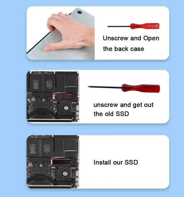 IMPORTANT NOTEBefore installing this new Macbook SSD, must upgrade your Mac to macOS 10.13 High Sierra (or 10.14 Mojave or 10.15 Catalina) or later macOS. These OS versions include an EFI firmware updates for Mac. Without the update, the new SSD will not be recognized.