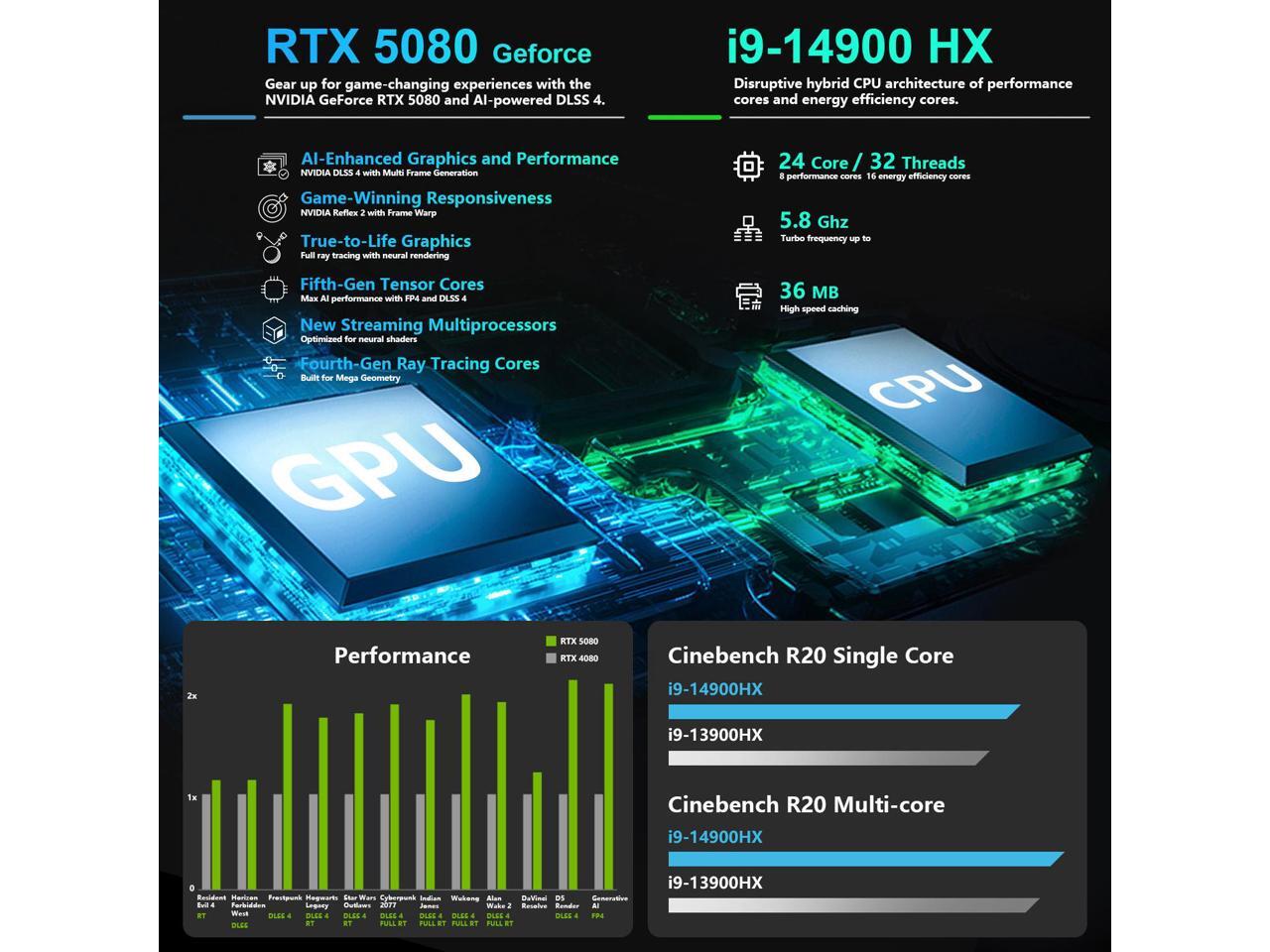 - [Blazing-Fast Speed & Graphics] 14th Gen Intel Core i9-14900HX ( 24 Cores, 32 Threads, 36MB L3 Cache, up to 5.8 GHzGHz max turbo frequency).