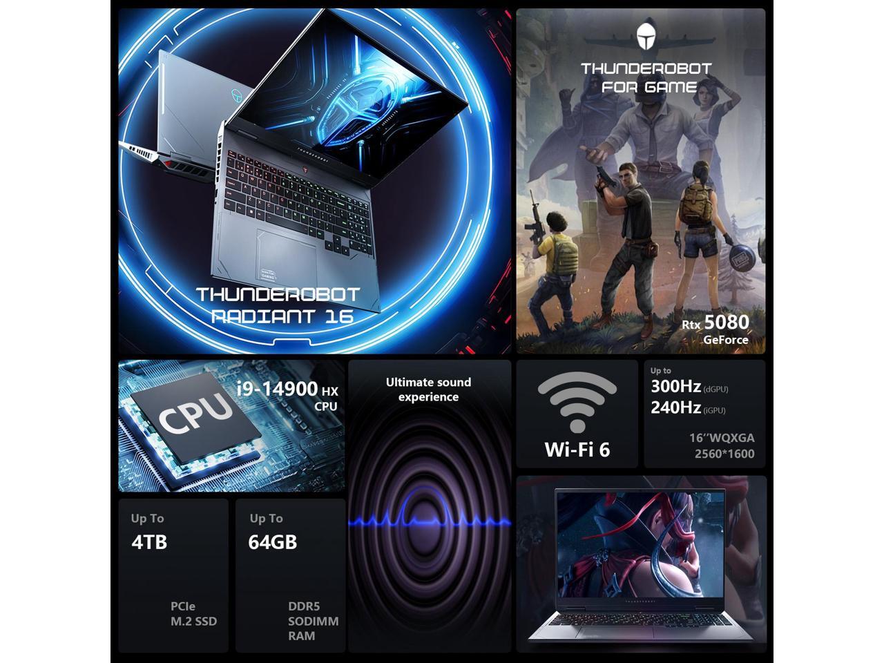 Thunderobot Radiant 16 300Hz Gaming Laptop, 16" WQXGA 300Hz, Intel i9-14900HX, GeForce RTX 5080, 64GB DDR5 RAM, 4TB SSD, RGB Backlit Keyboard, Wi-Fi 6, Win 11 Home