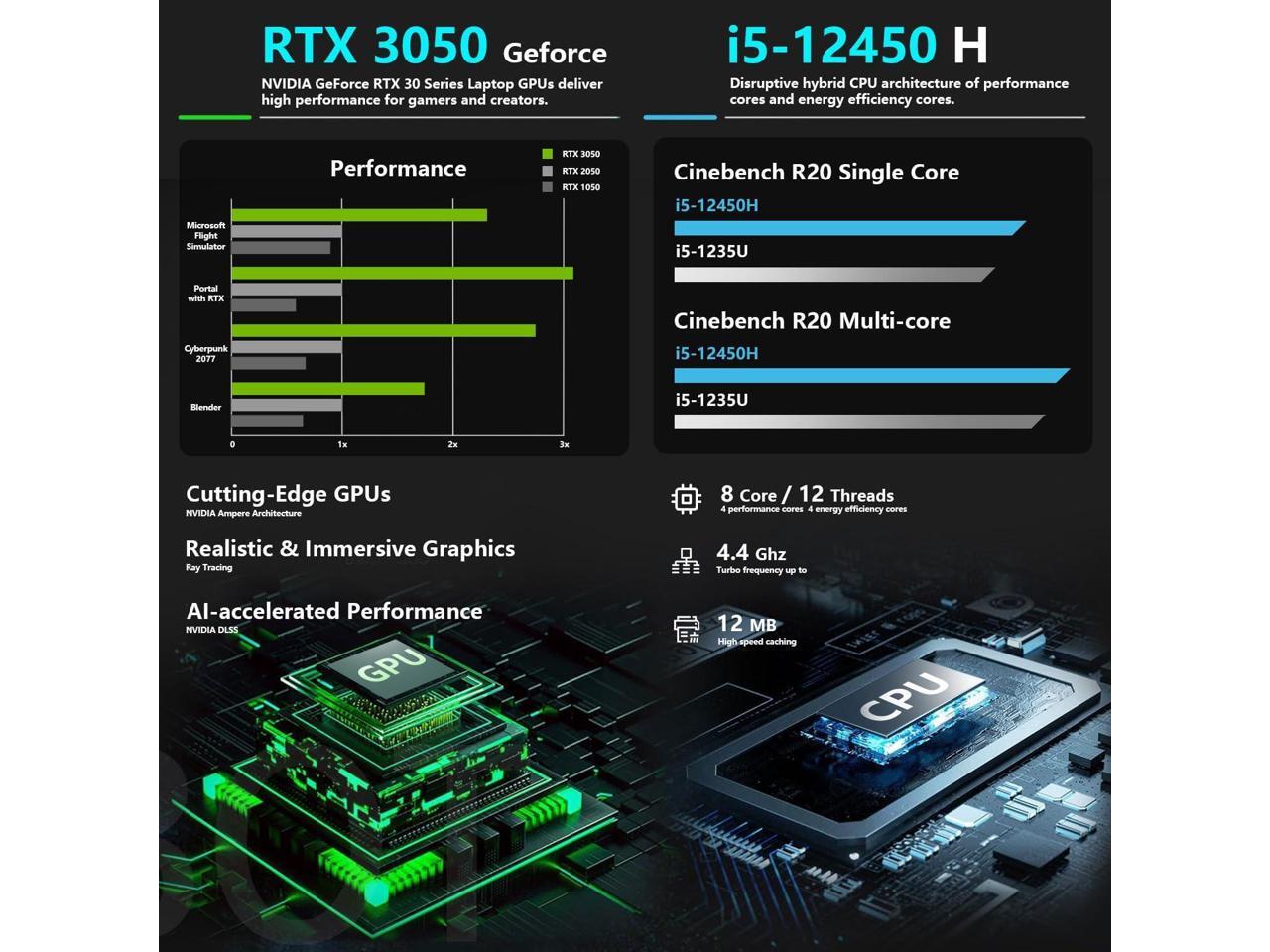 - [Unstoppable Power: Blazing-Fast Speed & Graphics] Core i5-12450H (8 Cores, 12 Threads, 12MB Cache, 2.0GHz base, up to 4.4GHz turbo) with GeForce RTX 3050.