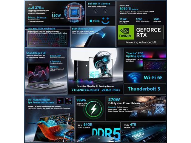 Thunderobot Zero 16 Pro 5070 Ti Gaming Laptop, 16" QHD+ 360Hz Hummingbird Display, Core Ultra 9 275HX, GeForce RTX 5070 Ti, 64GB DDR5, 4TB SSD, Per-Key RGB, FHD IR Camera, Wi-Fi 6E, Win 11 Home