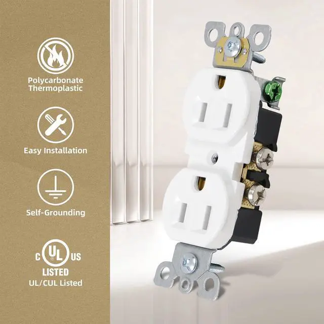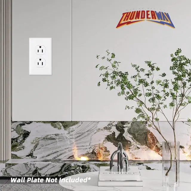 Upgrade your home or office electrical safety with the Thunderway 15A Duplex Receptacle. This pack of 10 white electrical outlets is perfect for any home renovation or building project, providing both convenience and value. With its tamper resistant design, these outlets increase the safety level in your home or office by preventing unwanted objects from being inserted into the outlet. The high-quality components and fire-resistant material ensure that you and your family are protected from potential electrical fires. These Thunderway outlets are ideal for both residential and commercial use, making it a versatile option for any space. The included decorative wall plates add a touch of elegance while also keeping the wallboard clean and providing an easy installation process. The compact design and push-in & terminal screws make the installation process quick and effortless, so you can enjoy your new outlets in no time. This Thunderway 15A Receptacle is UL Listed and backed by a 2-year warranty and 30-day money-back guarantee, ensuring that you are fully satisfied with your purchase. This TR receptacle is also rated at 15A/125V/1875W, making it a reliable option for powering your devices and appliances. Invest in safety and style with Thunderway's pack of 10 Duplex Receptacles. The combination of convenience, value, and electrical safety make it a must-have for any home renovator, builder, or anyone looking to upgrade their outlets. Trust the quality and performance of Thunderway for all your electrical needs.