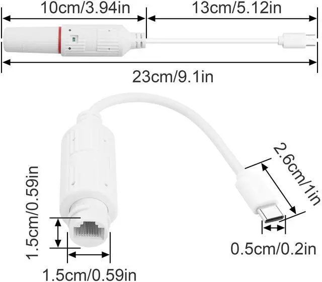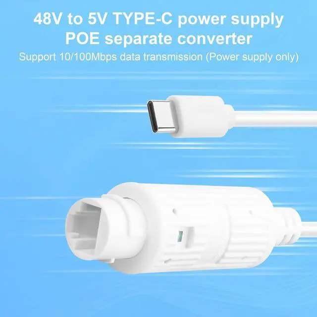 The PoE to USB-C adapter (17.4x10.7x2.5cm, 40g) converts 44-57V input to 5V/2.4A output, compliant with IEEE 802.3af/at. Featuring IP65 waterproof, wide operating temperature (-20°C~60°C), multi-protection, and a tri-color LED.For power only; no data