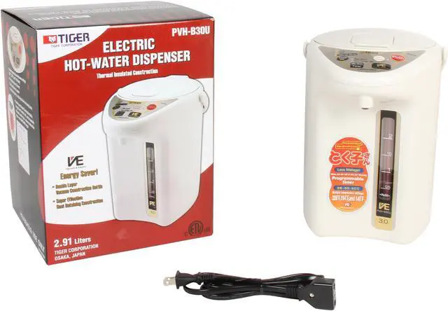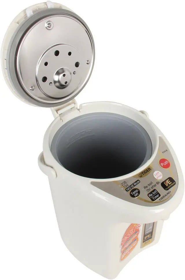 | Features | Locking insulated top and vacuum insulated body boils faster, keeps hot longer, and reduces energy costs by 30% Triple layered with true vacuum insulation: 2 stainless steel, 1 copper with a vacuum insulating layer in between which limits heat loss; energy saving, keeps water hot for hours without using electricity or having to reheat 3 Temperature settings: Boil (208F), Stay Hot (194F), Baby Formula (140F) Rotates on base for easy pouring in any direction Automatic 6-hour preset timer Gentle, 1-touch motor-assisted pouring prevents splashing Alarm sounds when water is too low Automatic safety shut-off when kettle is empty Large, easy to read water level scale Signal sounds when water heating is complete LED indicator light shows which function is in use Dechlorination feature eliminates unpleasant taste "Soft Touch" buttons and indicator lights for all functions Detachable lid for easy cleaning Non-stick coating ensures easy clean up Magnetic safety plug ETL Listed |