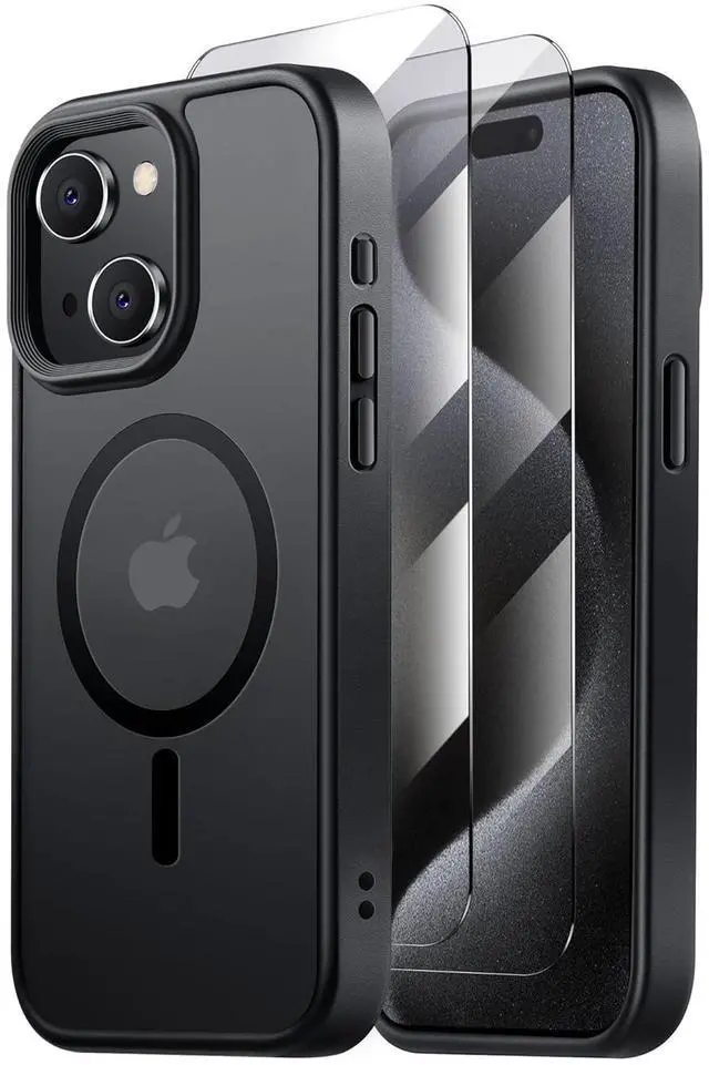 for iPhone 15 Case, Compatible with MagSafe [15FT Drop Resistant][2 Tempered-Glass Screen Protectors] Matte Skin-Feeling Shockproof case for iPhone 15 Cases 6.1", Black-Set