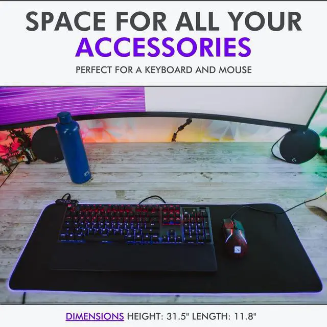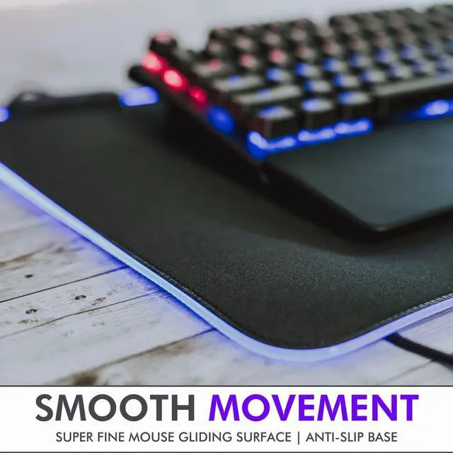 Here's a revised version that integrates all the keywords naturally into the product description: Elevate your gaming experience with our RGB Gaming Mouse Pad, an extended mouse pad designed to accommodate any keyboard and mouse setup. The dynamic RGB lighting offers seven static colors and multiple modes, including breathing, rolling, and jumping, to illuminate your gaming desk pad and create an immersive atmosphere. Crafted from durable, waterproof neoprene, this xl mouse pad stands up to spills and stains while providing a smooth surface for precise mouse movement. The pink desk mat option adds a stylish touch to your setup, while the anti-slip base ensures your gaming mouse pad stays in place even during intense gaming sessions. The 31.5" x 11.8" x .12" size allows for ample space, turning your desk into a full desk mousepad. Designed for gamers, this mousepad gaming essential offers a large surface area that fits both keyboard and mouse comfortably, ensuring smooth, precise control with its superfine fiber braided fabric. The led mouse pad brings a futuristic vibe to your setup, whether you choose to stick with static colors or cycle through dynamic lighting modes. Whether you're using a giant mouse pad or a gamer mouse pad, this gaming mat is the perfect complement to your rig, and with its durable build, it's easy to clean and will withstand even the most vigorous gaming sessions. Transform your workspace with our rgb mousepad and enjoy the comfort and precision that comes with it.