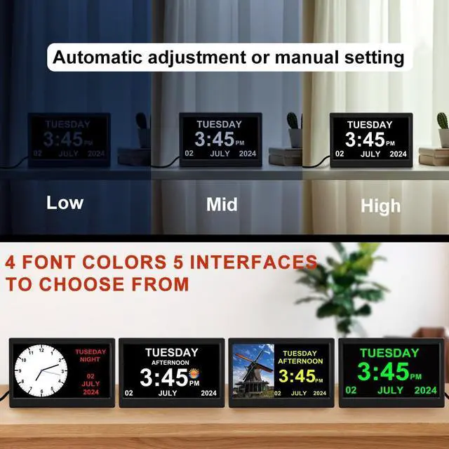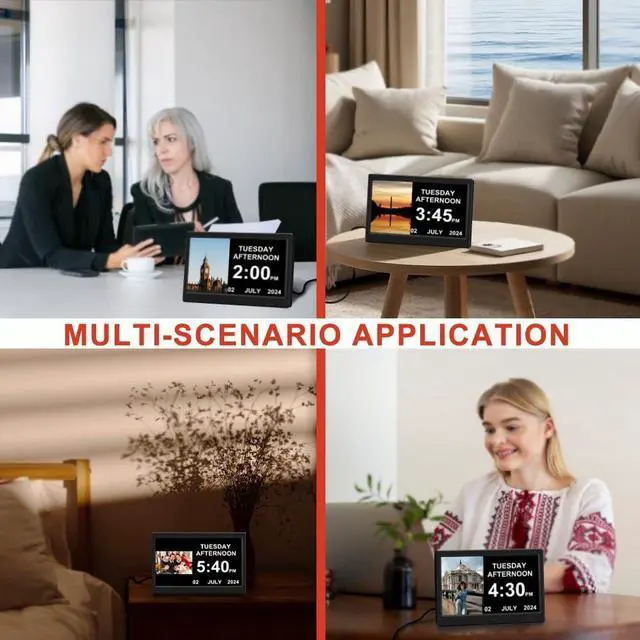 Creative feature: split screen display, with picture carousel on the left side of the screen, allowing for dynamic playback of images from your U disk by USB, and clock information on the right side; the elderly clock interface features extra-large fonts, with font colors adjustable