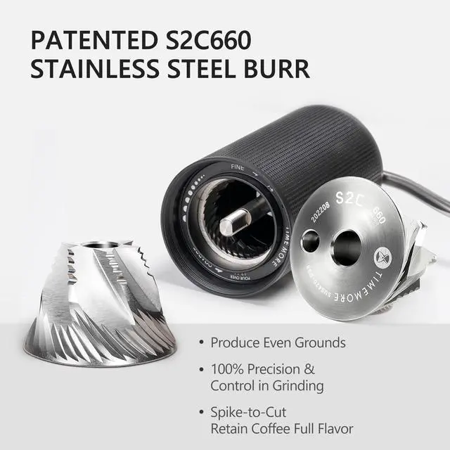 [ S2C Patent Hexagonal Conical Grinding Burr ] The TIMEMORE Manual Coffee Grinder is equipped with the revolutionary S2C660 patent conical burr. Hand Coffee Grinder Milling blade with 55-58HRC hardness in 5-axis CNC machining realizes uniform grinding with almost no excessively coarse grains. At the same time, the generation of fine powder is minimized. This advanced burr design ensures a consistent and even grind size, allowing for the perfect extraction of flavor from every bean