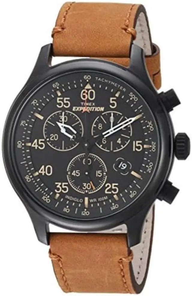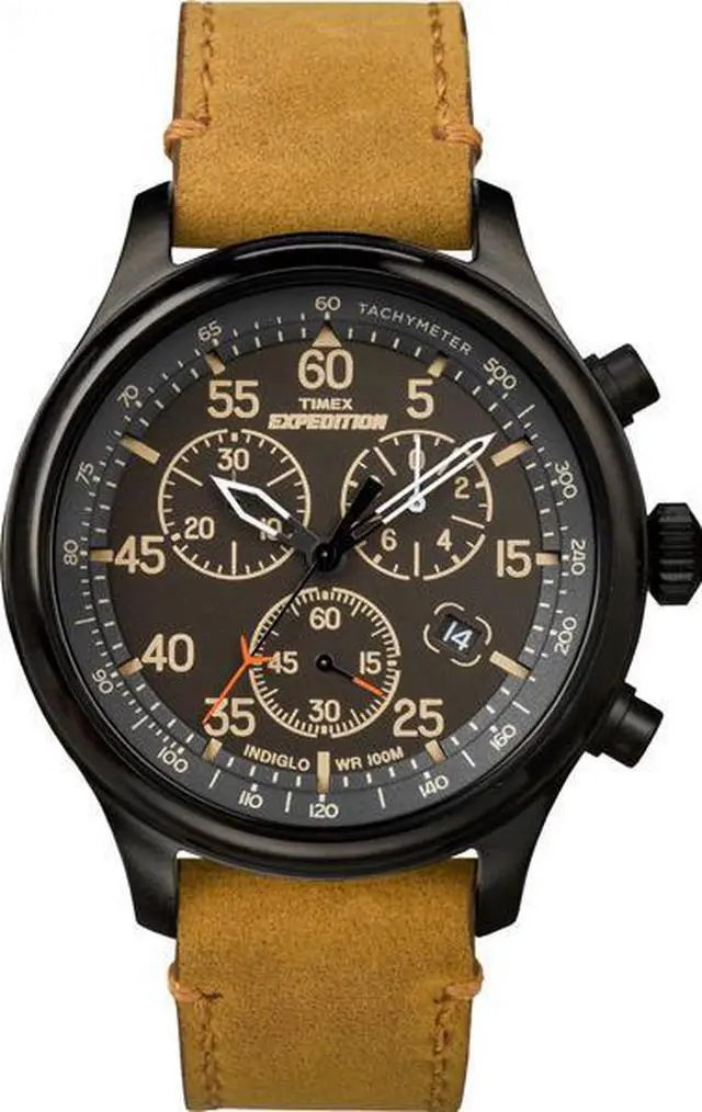 A rugged and functional timepiece the Expedition Field Chrono features a black case a black dial and a contrasting tan leather strap. The highly precise quartz chronograph movement allows for accurate measurement of elapsed time perfect for active users. The bold dial design ensures excellent visibility in various conditions staying true to its Expedition heritage. This is a tough dependable watch built for the demands of the field.