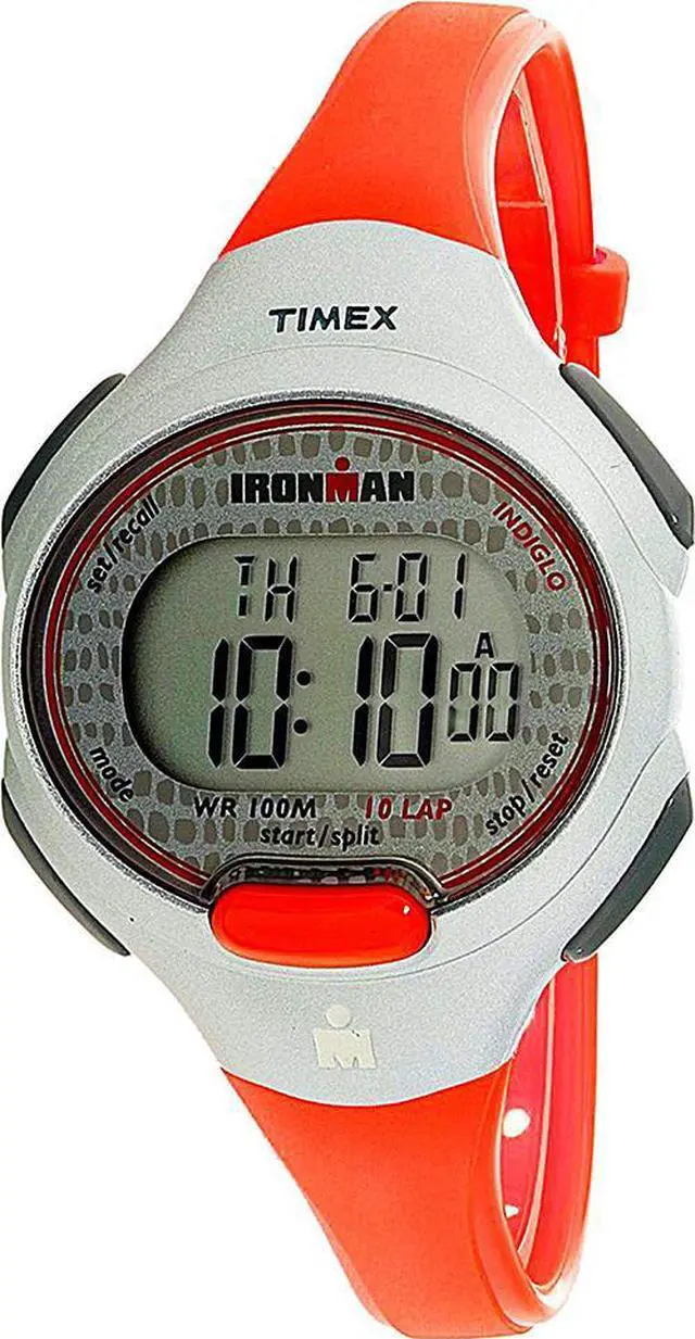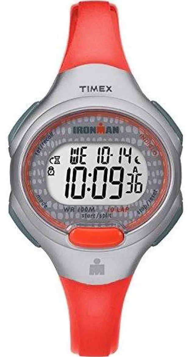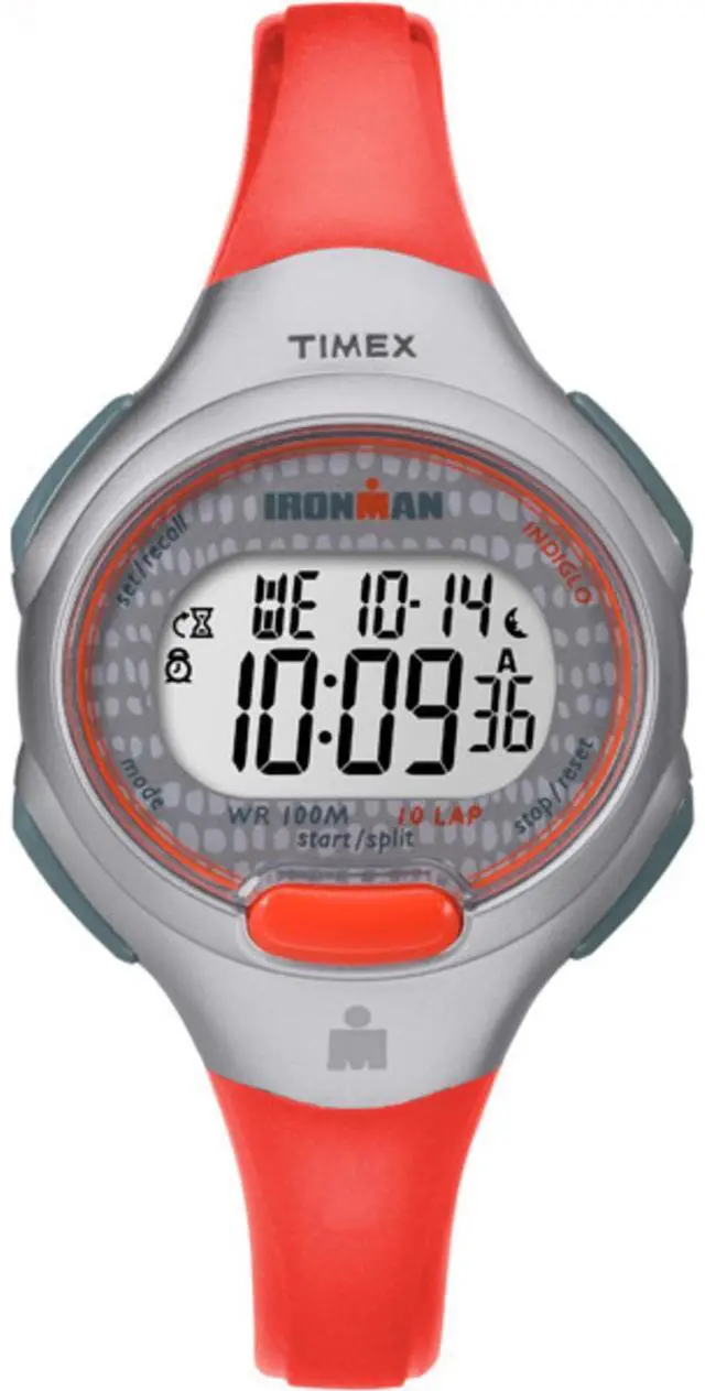 Designed to withstand the pool, ocean, shower and your workout with essential sports timing functions, this digital watch is lightweight and perfect for staying active. This women's Timex Ironman Essential 10 mid-size watch features a blue resin strap, a gray resin case, and an easy-to-read gray digital display. Indiglo night-light aids with readability in low lighting. This watch is water resistant to 100 meters (300 feet).