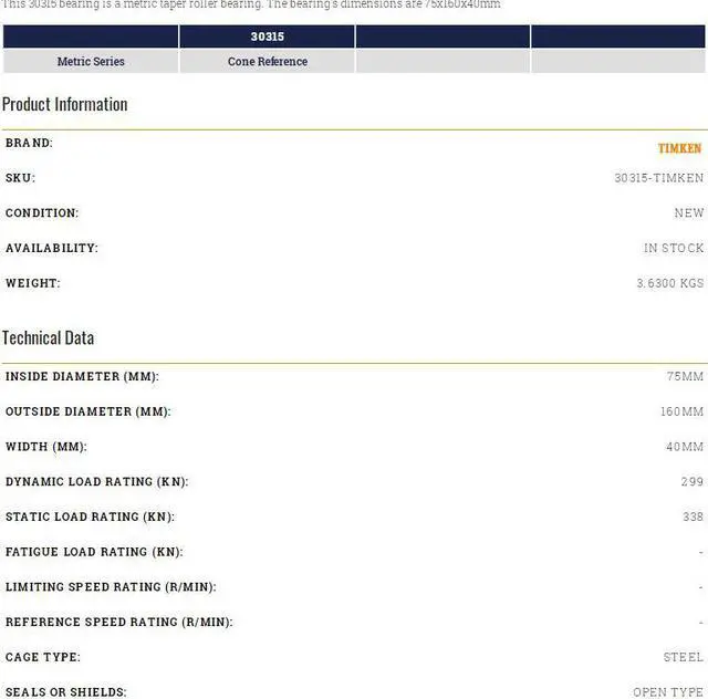 • TIMKEN 30315 Taper Roller Bearing 75x160x40mm