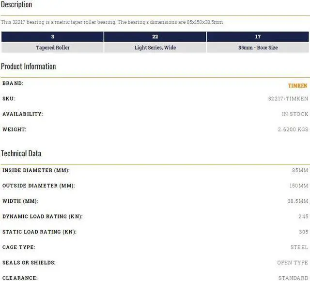 • TIMKEN 32217 Taper Roller Bearing 85x150x38.50mm