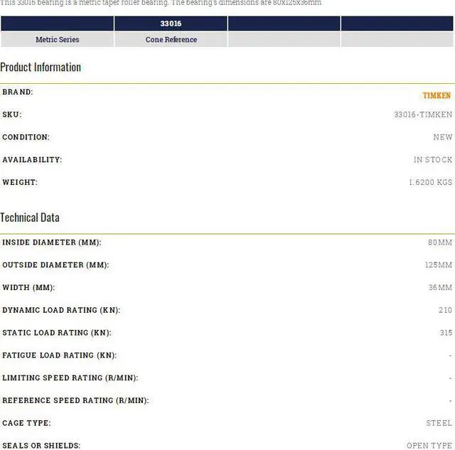 • TIMKEN 33016 Taper Roller Bearing 80x125x36mm