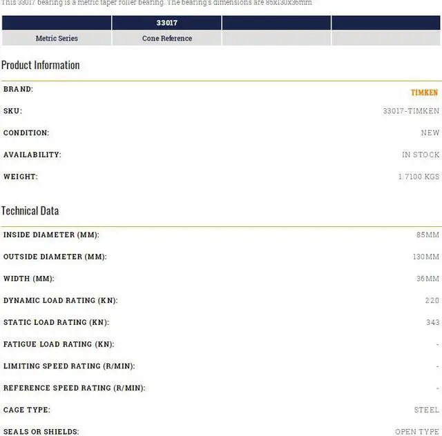• TIMKEN 33017 Taper Roller Bearing 85x130x36mm