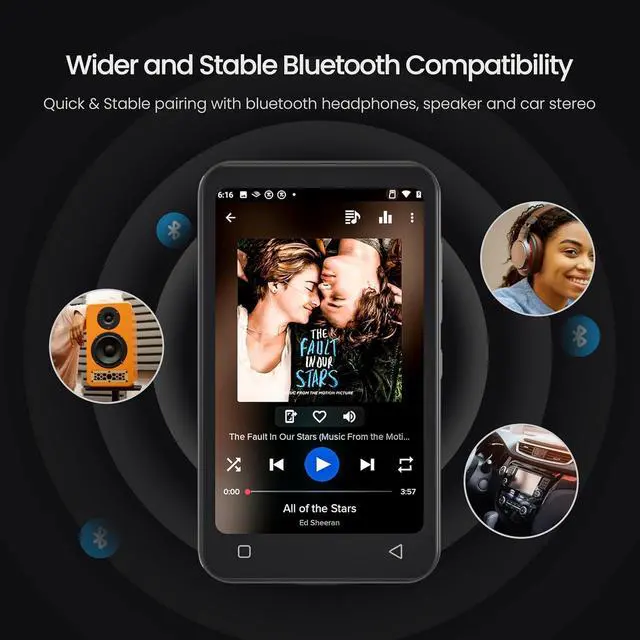 WiFi and Bluetooth Connection - Wifi mp3 player not only provides USB cables to upload music and videos, but also can share or transfer files via bluetooth and wifi. And it is also compatible with other versions of bluetooth devices, such as headphones, speakers, car stereos, and provides fast pairing and stable connections.