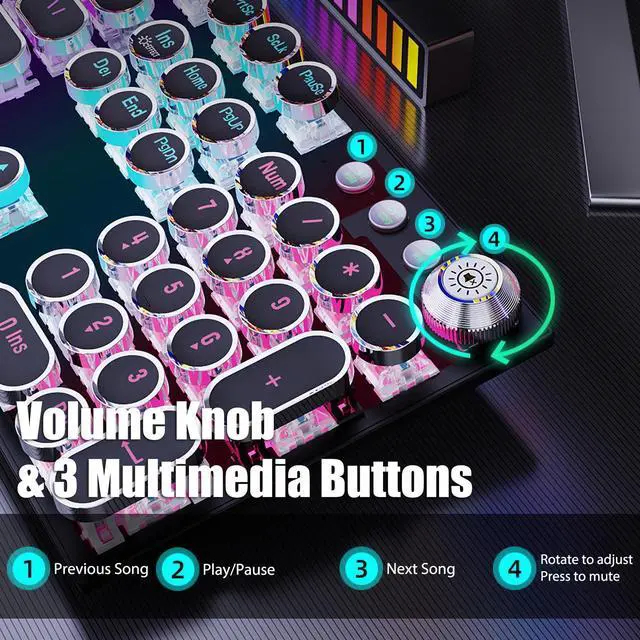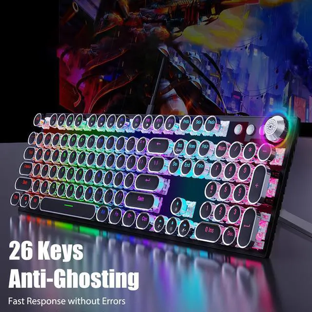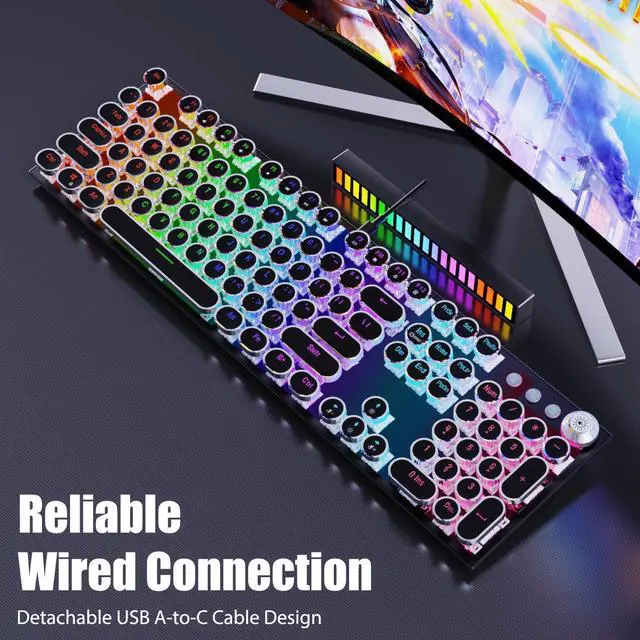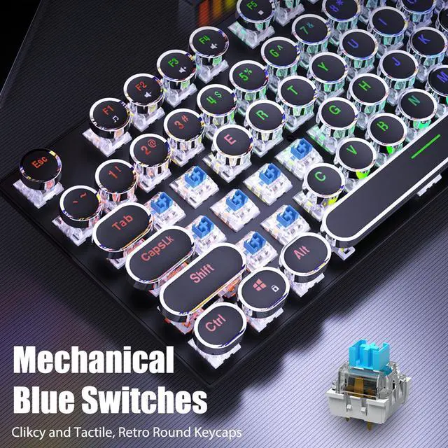 With mechanical blue switches, this keyboard delivers ultimate gaming performance. The mechanical keys offer medium resistance, an audible click sound, and tactile feedback. Vintage steampunk round keycaps with silver rings make it resemble a classical typewriter, creating a vintage atmosphere and a comfortable typing experience.