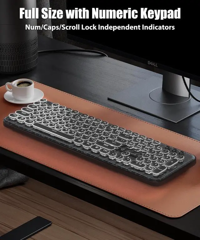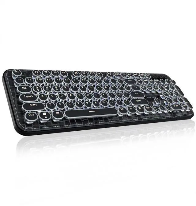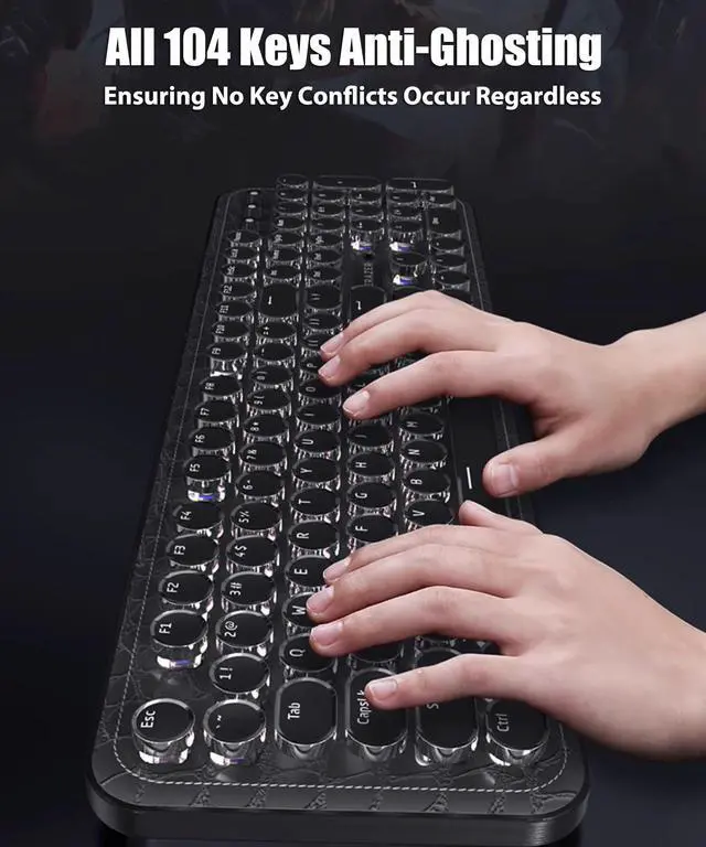 This retro punk keyboard features mechanical blue switches and round keycaps with silver rings, combining vintage style and modern technology. The blue switches have a lifespan of 60 million keystrokes, offering fast response, distinct tactile feedback, and a typewriter-like sound. The keycaps adopt double-shot injection molding technology, ensuring uniform light transmission for characters, which can be clearly displayed in dark environments.